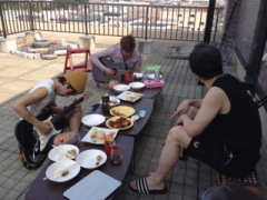 ベランダでテーブルを置き、椅子を出して