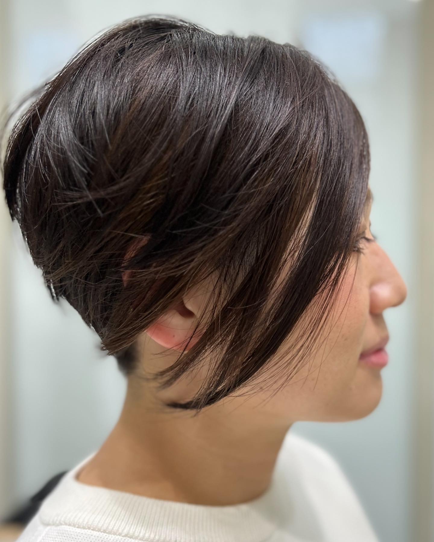 - 前下がりシルエットのショートボブスタイル→→フロントビューはフェイスラインに沿った長めのレングスでありながら耳後ろの厚みが無くスッキリしています。